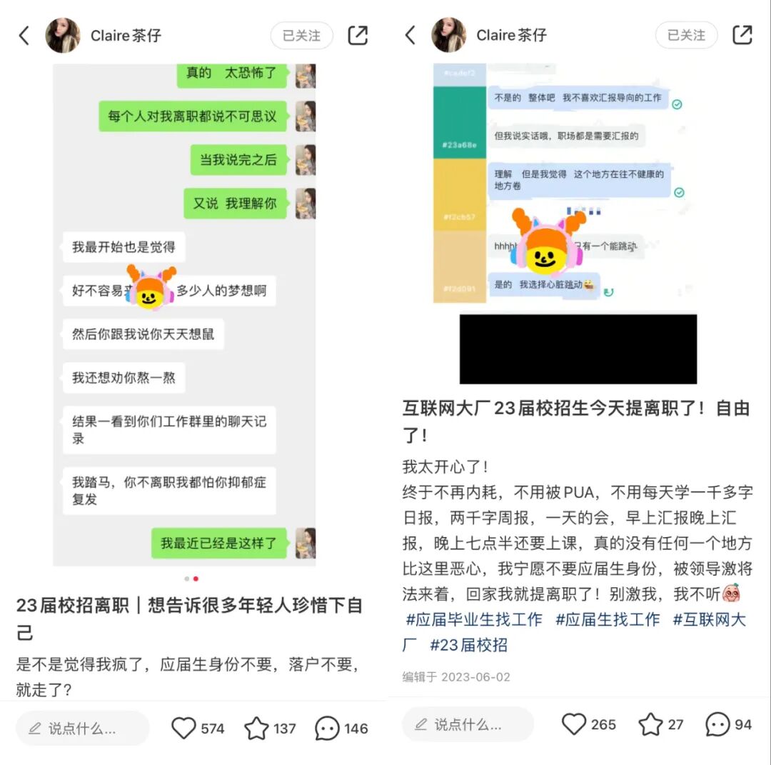 “每天要写千字的日报、早上汇报晚上汇报、默认每天加班”, @Claire茶仔向我们回忆道,“有一次下班后领导把我喊回去,问我生病了为什么不能写汇报、为什么我12点多就睡了,当下我就决定不转正了。”