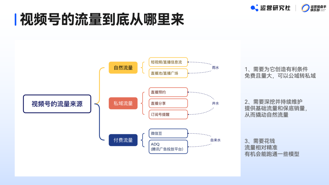 孙先生看来,视频号的流量主要分为自然流量、私域流量、付费流量三类。