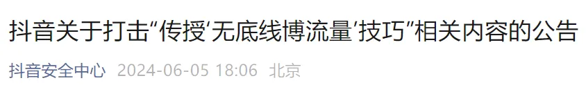 6月5日,抖音安全中心发布关于打击“传授‘无底线博流量’技巧”相关内容的公告。
