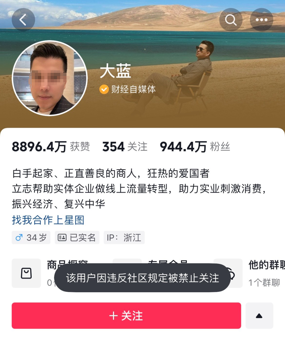 与此同时,拥有近千万粉丝的网红“大蓝”受此波及,其账号被禁止关注,而这也不是近期唯一一个被抖音“下重手”的网红。