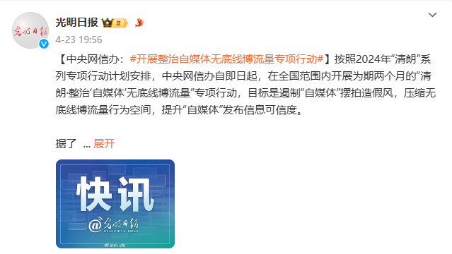 4月23日,多家官媒报道,按照2024年“清朗”系列专项行动计划安排,中央网信办自即日起,在全国范围内开展为期两个月的“清朗·整治‘自媒体’无底线博流量”专项行动,目标是遏制“自媒体”摆拍造假风,压缩无底线博流量行为空间,提升“自媒体”发布信息可信度。