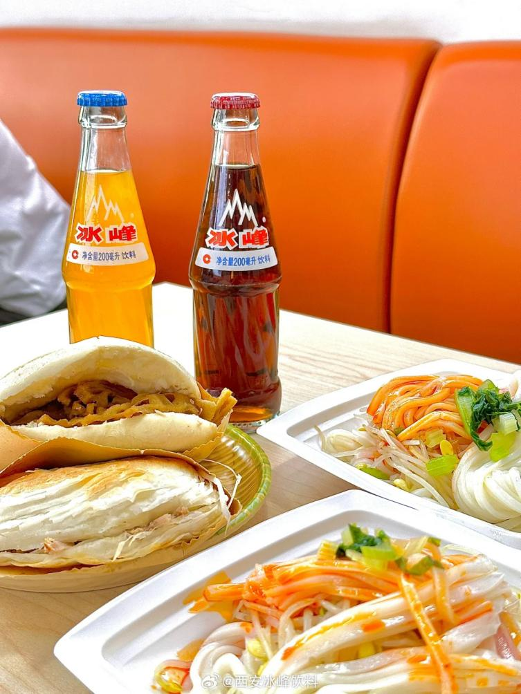 作为在陕西有着70多年历史的冰峰汽水,它在西安当地的受欢迎程度,让人发指,吃凉皮肉夹馍烤肉油泼面胡辣汤统统都配它,日销量保持在50万~70万瓶之间,年销量达3亿。