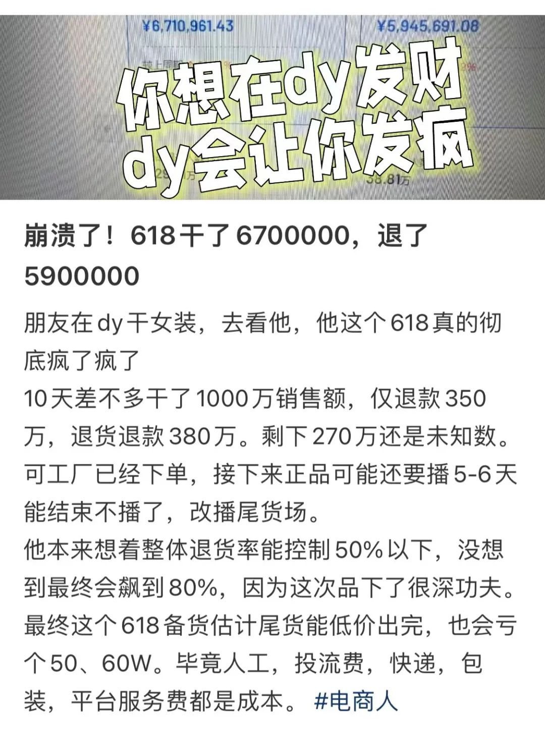 前不久,有网友在某社交平台吐槽称,自己朋友在抖音平台的女装网店,618期间销售额将近1000万,但其中仅退款有350万、退货退款的有380万,再刨除各项成本开支,预计亏损50万到60万。