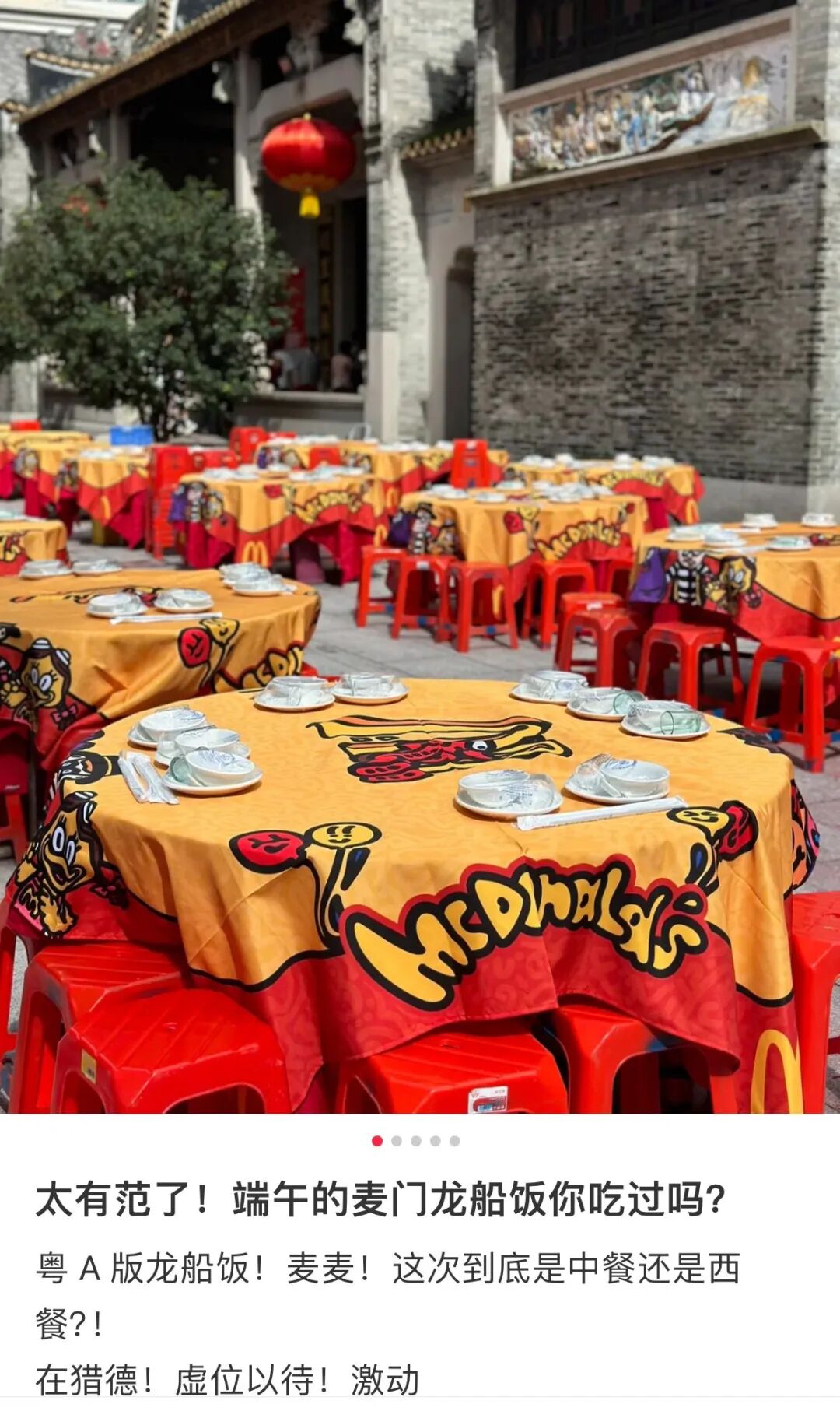 在端午期间,麦当劳承包龙舟赛宴席,标志性的红黄配色与广东传统的“省凳”完美融合,充当史上最强气氛组,隔着屏幕都能感受到开席的快乐。