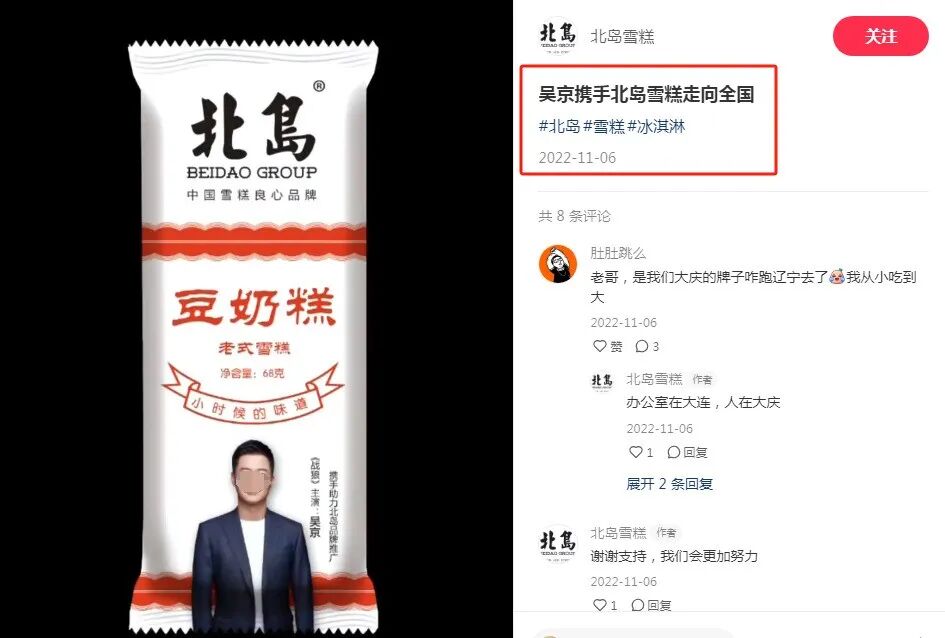 如果北岛雪糕和吴京达成合作,想必也会取得不错的市场反响。