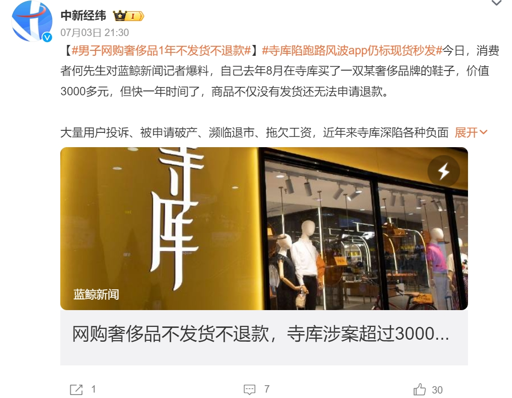 就在7月初,有消费者向媒体爆料称:去年8月他在寺库买了一双某奢侈品牌鞋,价值3000多元,但下单接近一年,该商品不仅没有发货,还无法申请退款。