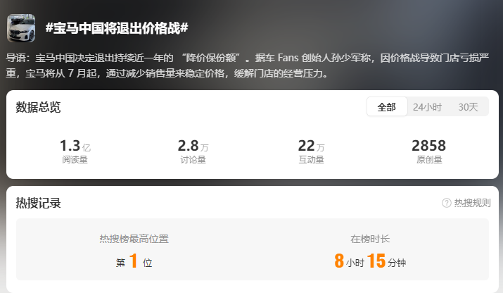很快,#宝马中国将退出价格战#、#宝马开始涨价了#的消息接连登上微博热搜。