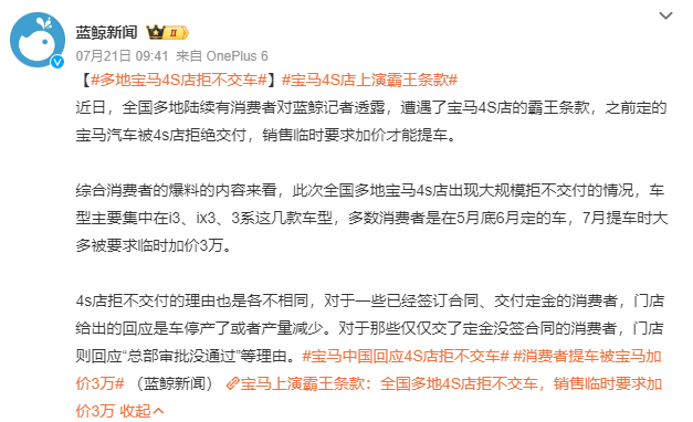 7月21日,据蓝鲸新闻报道,全国多地陆续有消费者透露,在4S店提车之时都遭遇了宝马的霸王条款,要么拒绝交付,要么销售临时要求加价才能提车,数额高达3万元。