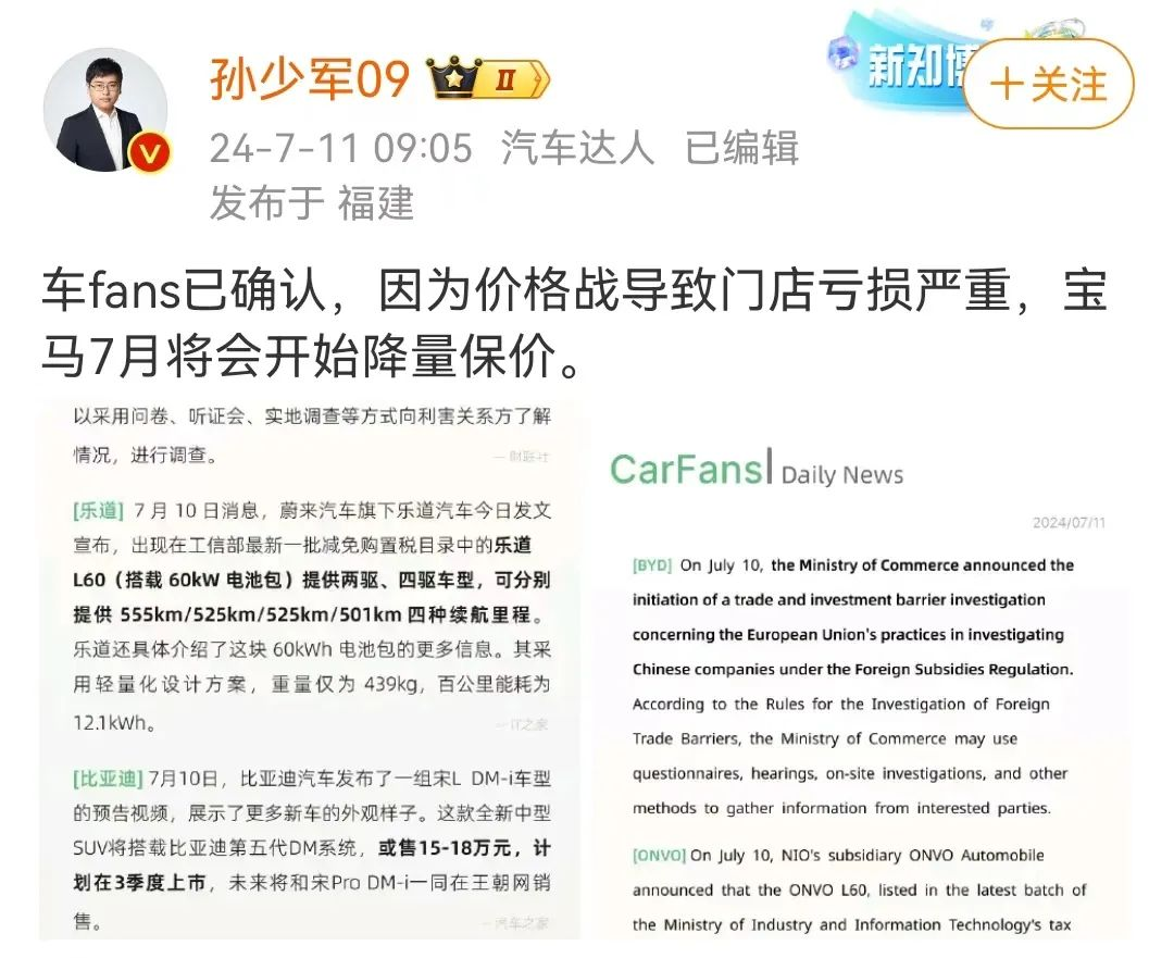 但在7月11日,有博主在微博发文称,因为价格战导致门店亏损严重,宝马7月将会开始降量保价,缓解门店的经营压力。