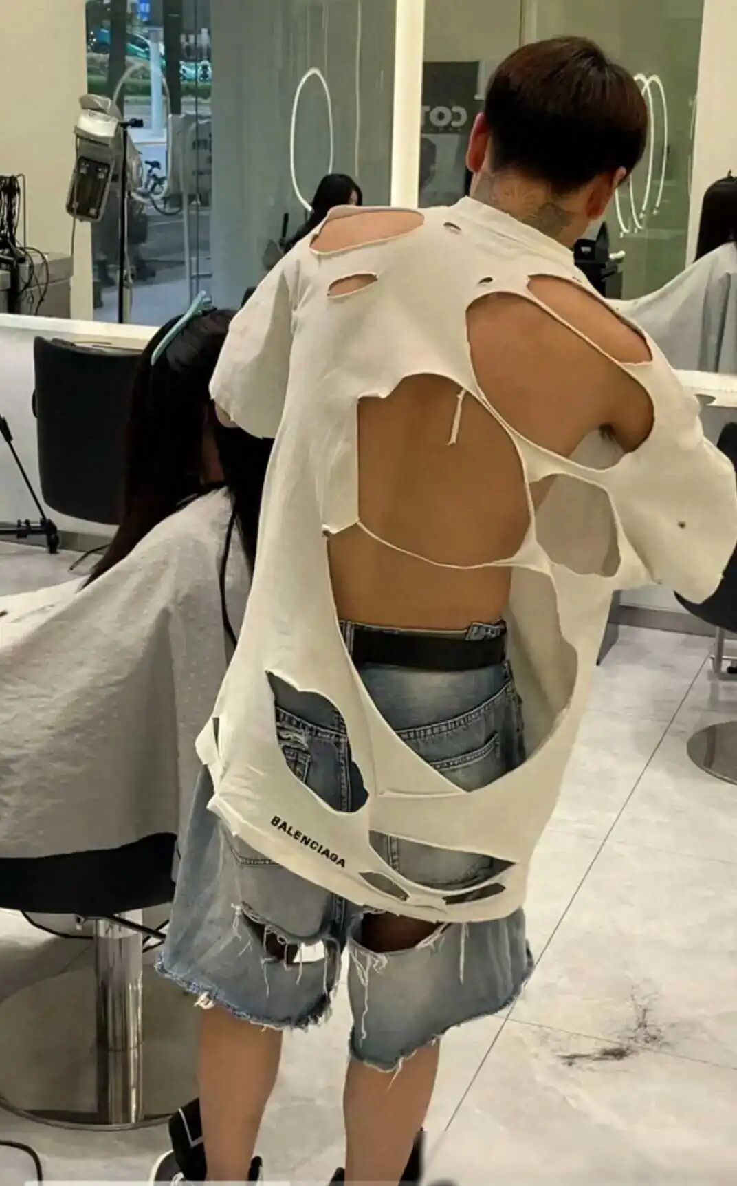 巴黎世家的破洞T恤,背后布满了大小不一的“伤口”,看起来像是刚刚经过一场激烈的撕扯打斗,和乞丐服有得一拼。