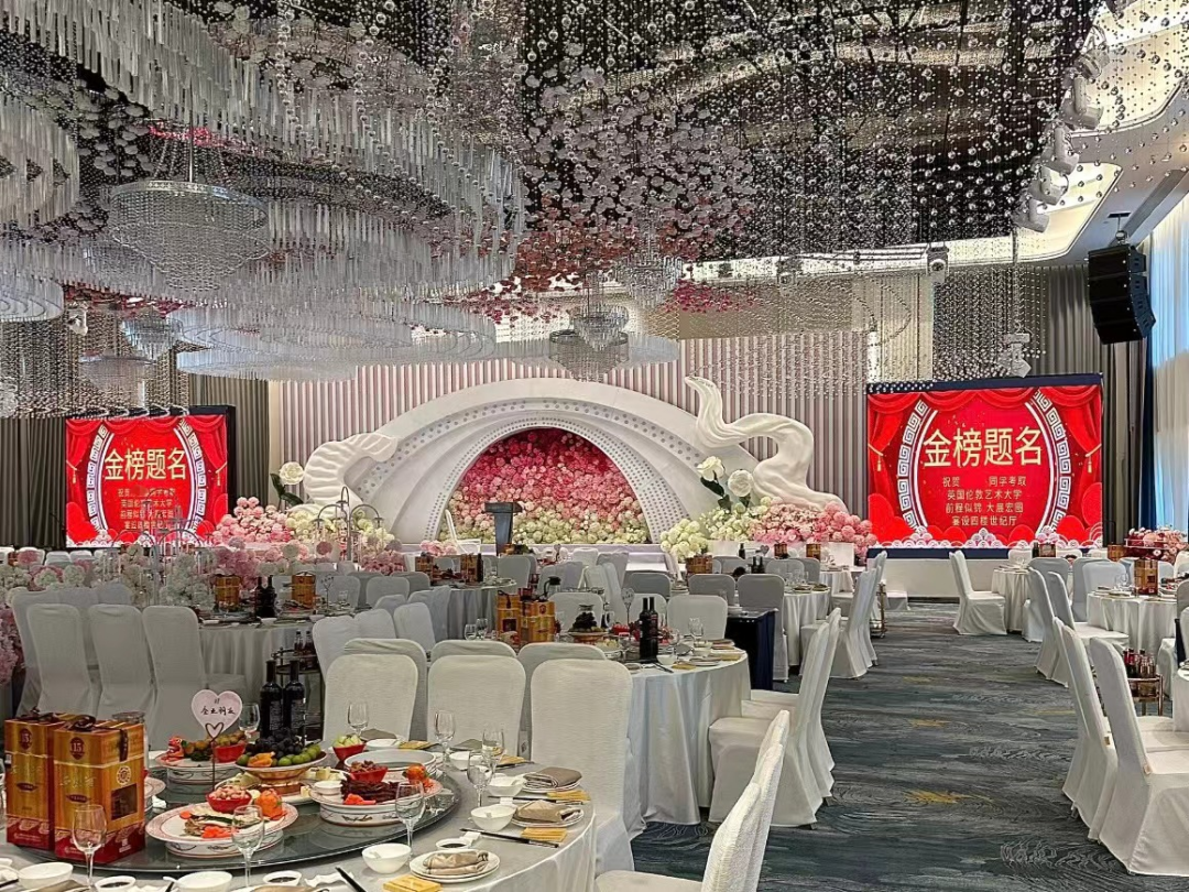 数百平的酒店宴会厅里摆着18张可以坐满12人的圆桌,大厅一侧半人高的舞台上摆满了鲜花。舞台左右各有一块LED大屏,上面写着“金榜题名”……