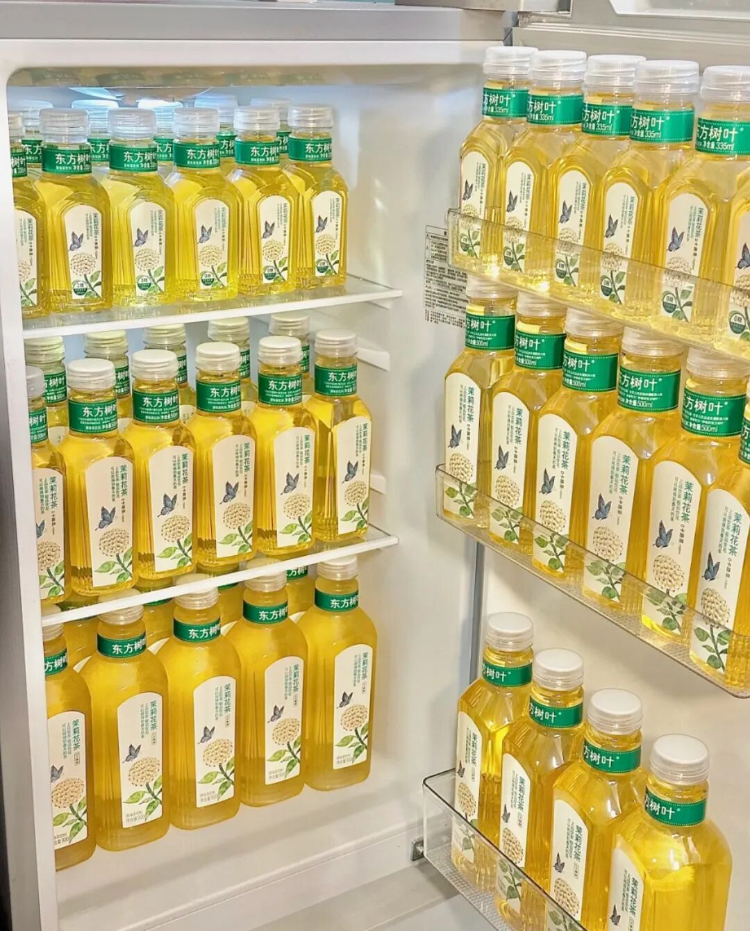 2023年,年轻人对大包装饮料关注度越来越高。东方树叶于当年年初在天猫旗舰店上线了900ml的大瓶装。到今年,东方树叶900ml大瓶装已经在线下渠道铺开,甚至占据了货架C位。