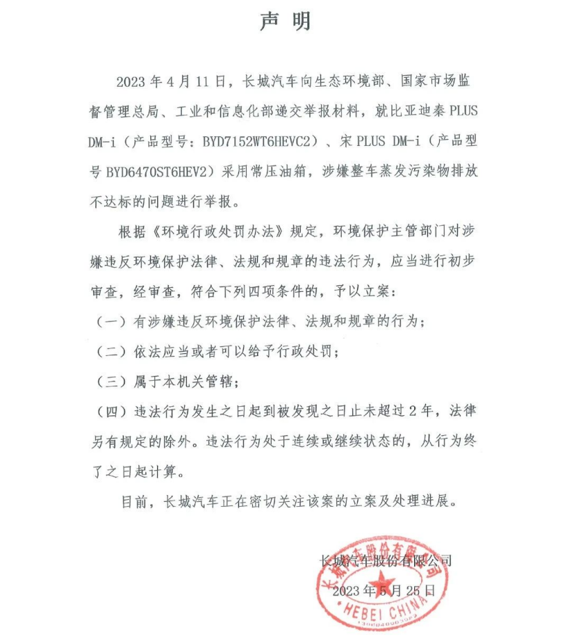 但业内最令人震惊的还是“油箱门”事件。2023年5月,长城汽车发布声明称,向生态环境部、国家市场监督管理总局、工业和信息化部递交举报材料,就比亚迪秦PLUSDM-i、宋PLUS DM-i采用常压油箱,涉嫌整车蒸发污染物排放不达标的问题进行举报。