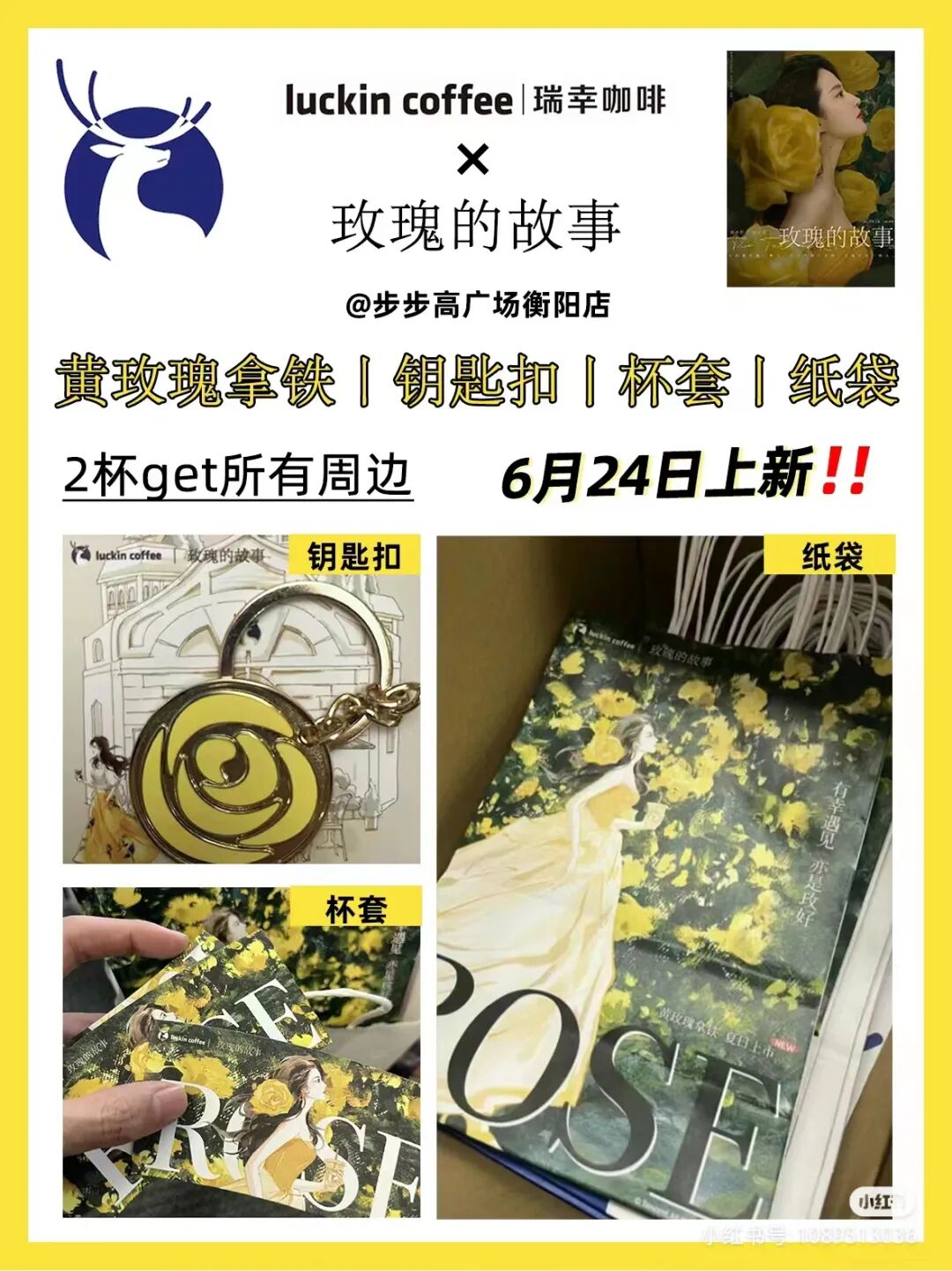 看到隔壁喜茶的大成功,素来酷爱联名的瑞幸也坐不住了,出了一款叫做黄玫瑰拿铁的新品,周边包括联名纸袋和钥匙扣。