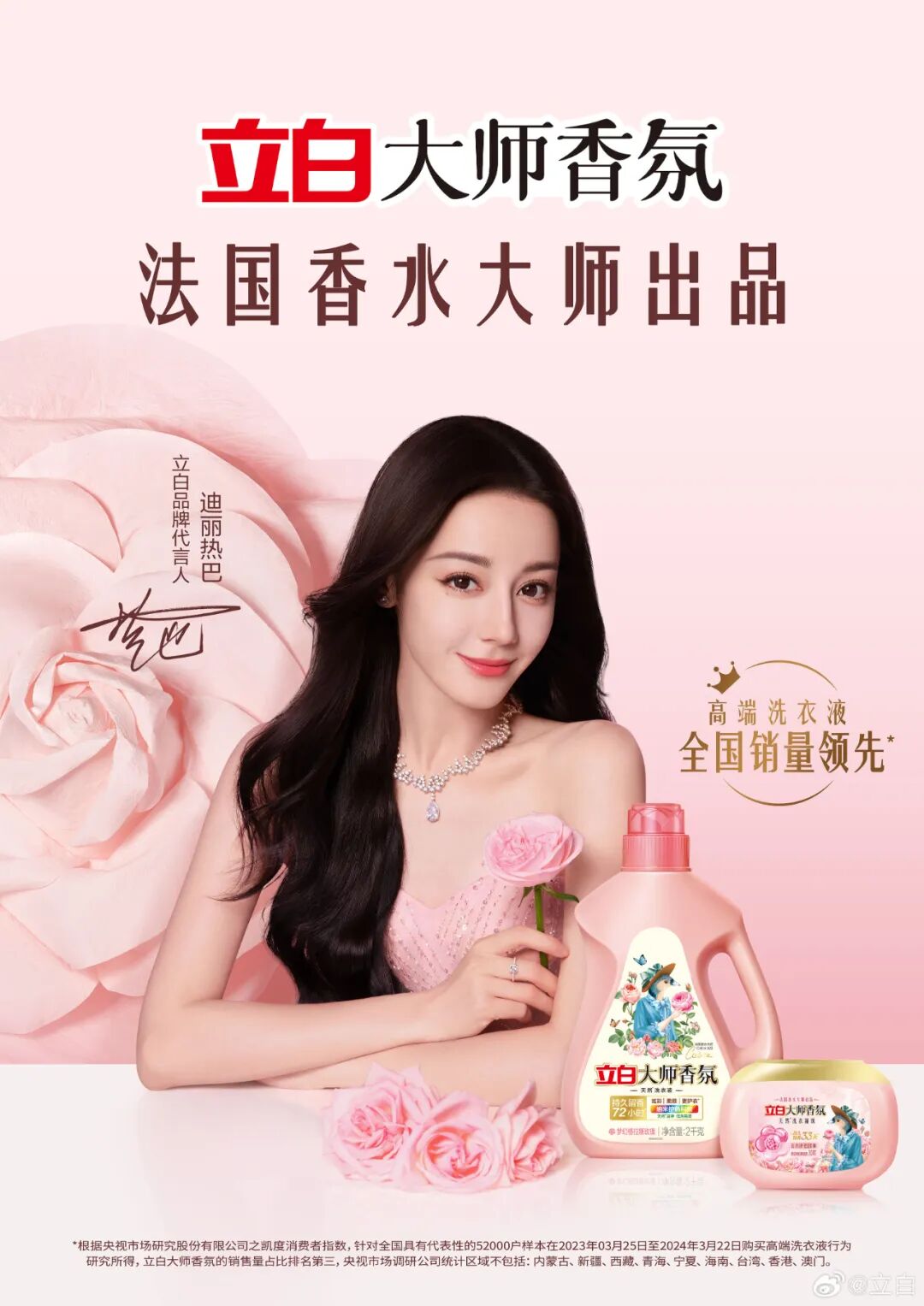 立白最新官宣迪丽热巴为品牌代言人,并联合Vogua为迪丽热巴拍摄了一支广告大片,置身于玫瑰花庄园里的迪丽热巴像萦绕着花香的玫瑰公主。
