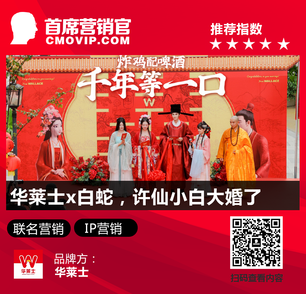 点评:华莱士通过与国漫白蛇联名,将这一爱情故事与自身品牌故事相结合,还在西湖边打造了大婚名场面,真的走心了。