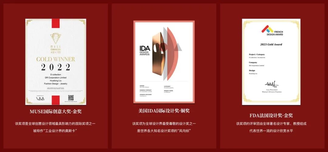 DR不仅已拥有超200项国家专利,更是斩获国际珠宝行业的设计“大满贯”:包括“设计界奥斯卡”之称的美国MUSE设计大赛、法国国际设计大赛和美国IDA设计大赛三项国际权威大奖。