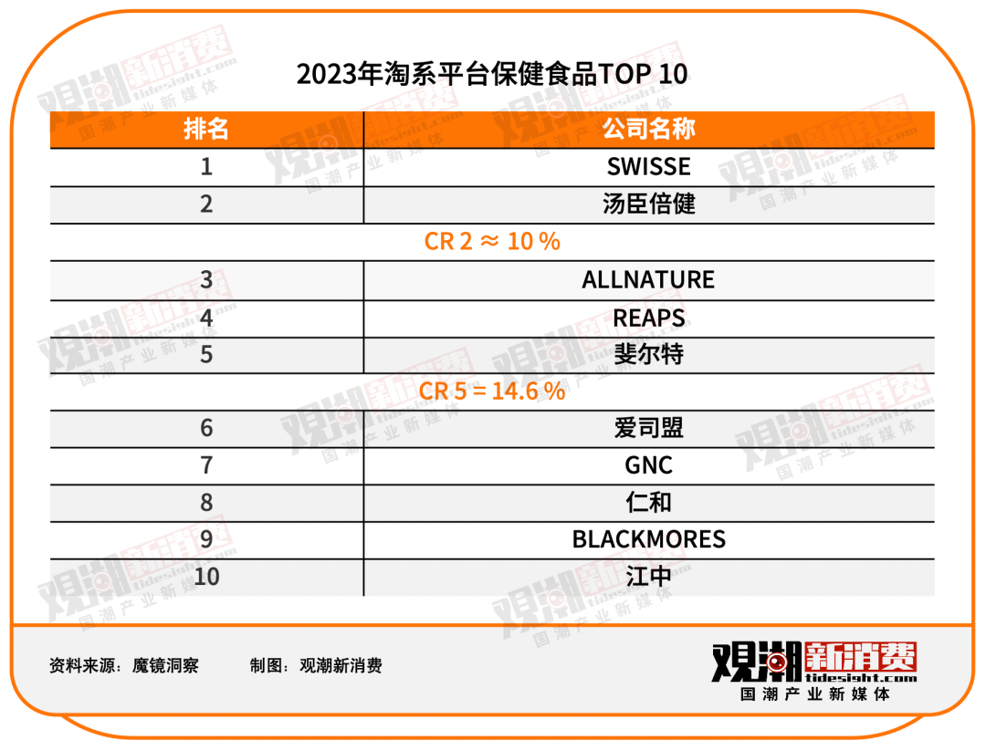 此前观潮新消费(ID:Tidesight)曾在文章《国潮风云|汤臣倍健VS Swisse:谁是年轻人的「续命药」?》中指出,汤臣倍健和健合集团旗下的Swisse分别位居2023年淘系平台保健食品类目的TOP2和TOP1。