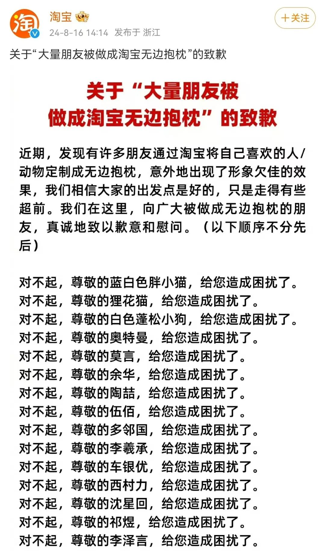 如果淘宝不主动出来道歉,我们都不知道无边抱枕案“受害者”群体如此广泛、如此庞大,道歉名单太长,一页屏幕装不下。即便这样,仍然是挂一漏万,评论区还有其他“受害者”找上门来。