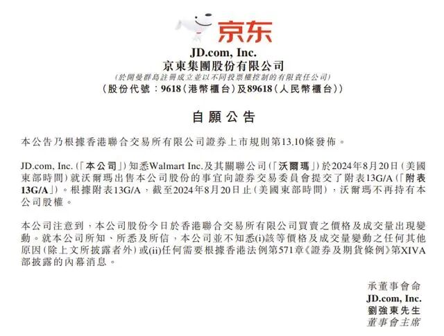 8月21日,京东集团公告称,本公司知悉Walmart Inc.及其关联公司沃尔玛于美国东部时间8月20日就沃尔玛出售本公司股份的事宜向证券交易委员会提交了附表。根据附表,沃尔玛不再持有本公司股权。