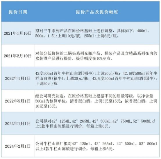 但这很难说是向高端化转型的成绩,因为除了推出高端的新产品外,近年来,顺鑫农业也多次提高白酒产品价格。据不完全统计,自2020年12月至今,顺鑫农业共计发布6次白酒涨价公告,涉及不同价位产品。