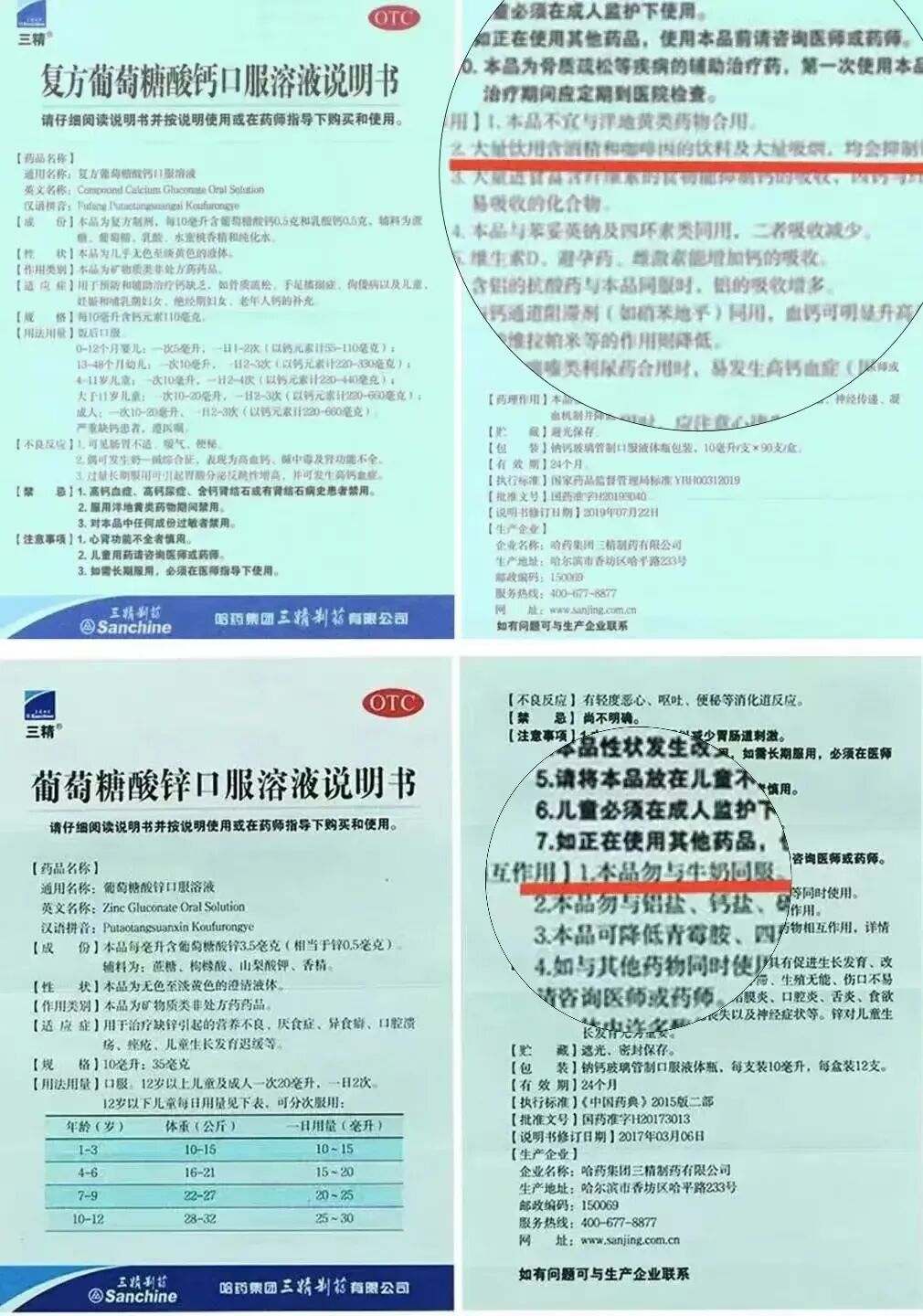 而补锌的葡萄糖酸锌口服液说明书中则明确写着“本品勿与牛奶同服”。