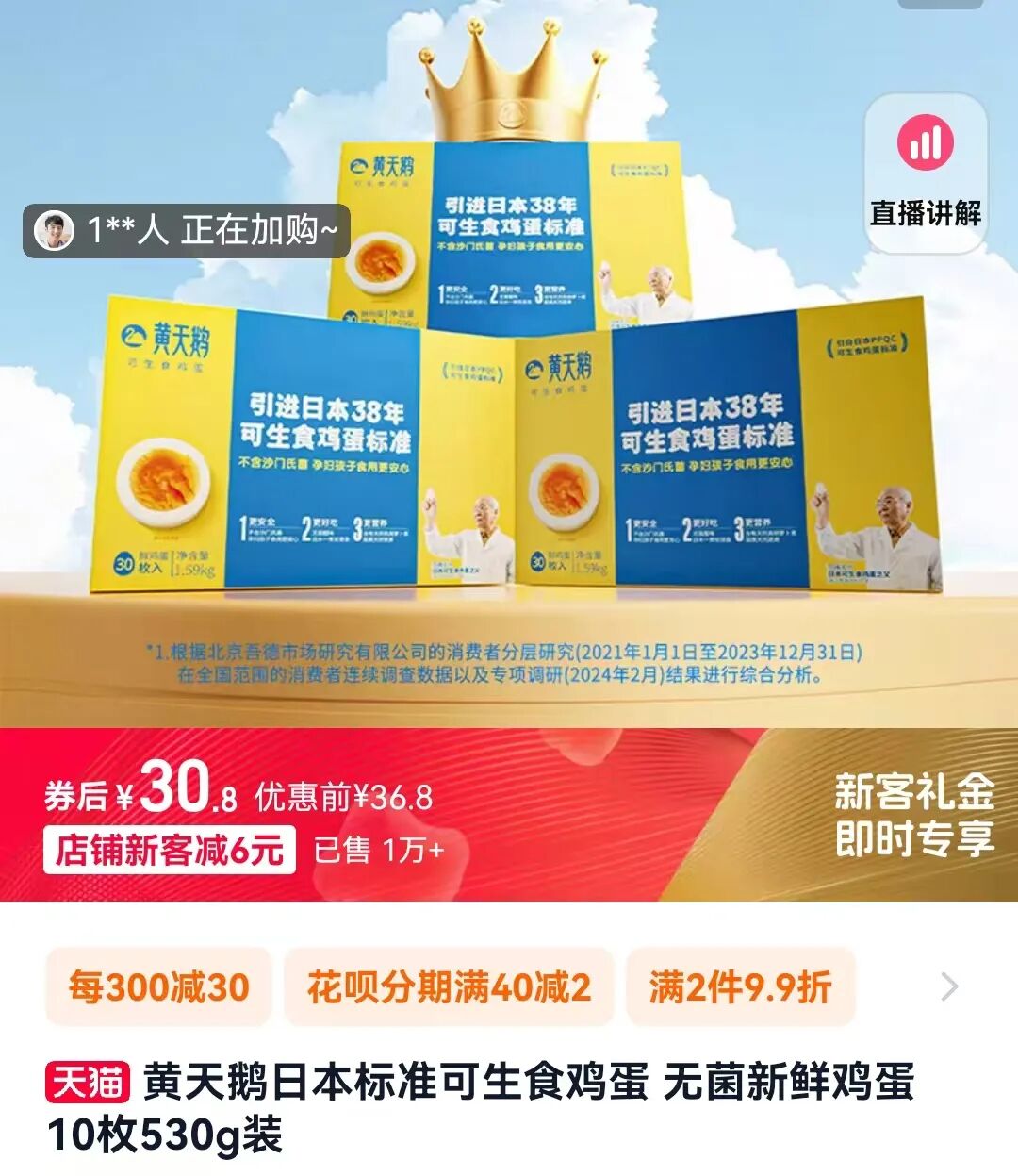 在天猫“黄天鹅旗舰店”,“引进日本38年可生食鸡蛋标准”这一内容被重点推介;在鸡蛋包装盒上,除了这一内容,还加上“更安全”“更好吃”“更营养”及相关介绍。