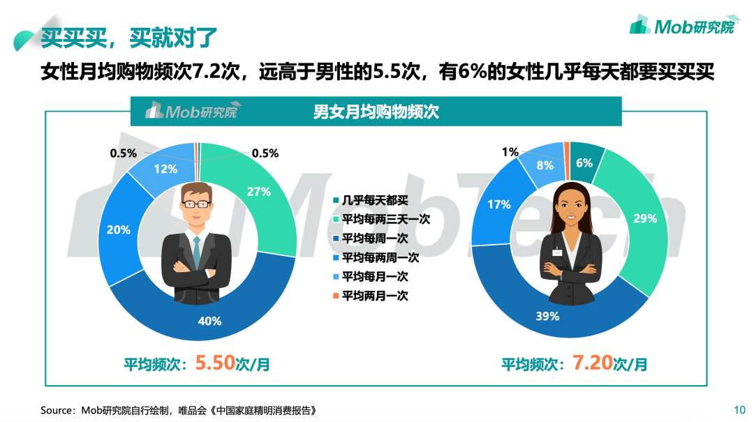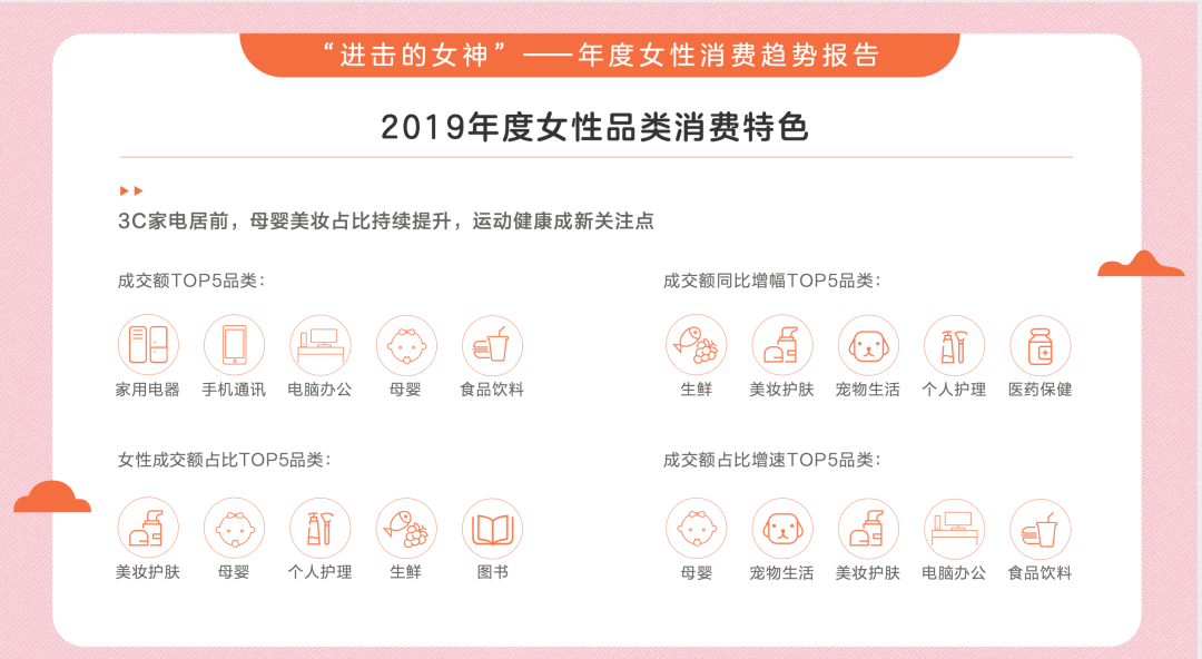 女性成为主要购买力早已是不争的事实。在2020年Mob研究院《2020年“她经济”研究报告》的数据显示,中国互联网女性用户占据了5.3亿,活跃规模在1亿左右,占比高达58.5%。女性月均购物频次达7.2次,远高于男性的5.5次,有6%的女性几乎天天买买买。在《2020年女性消费趋势报告》的女性品类消费特色中显示,家用电器占据成交TOP5,家用电器更是成了女性的新宠。