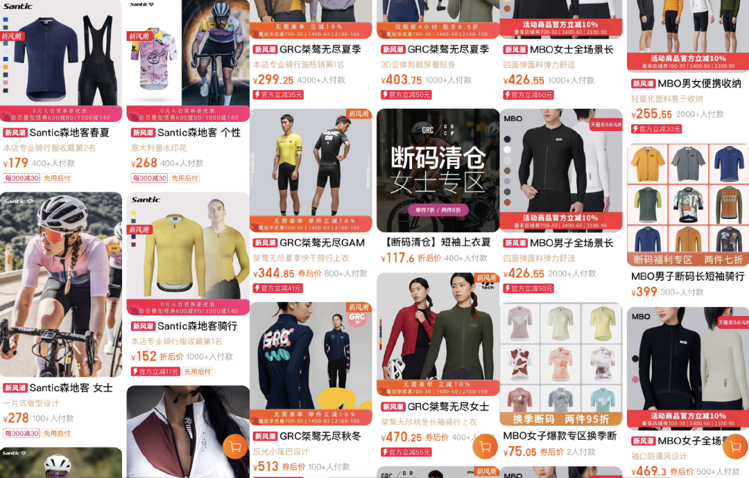 国产骑行服第一梯队品牌的淘宝店铺定价