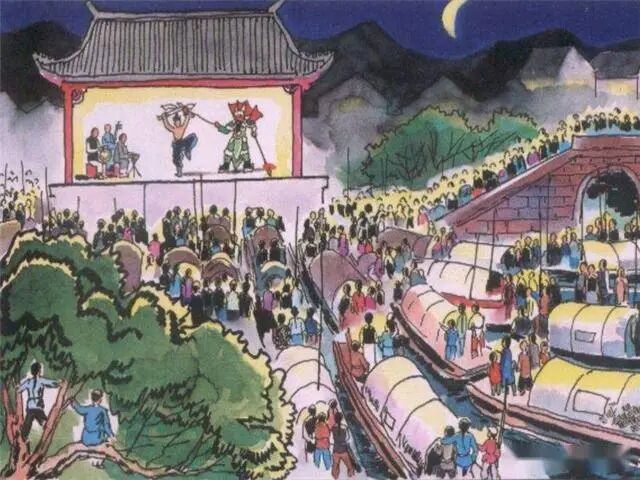 在绍兴,每年民间都有社戏演出,届时众彩纷呈,四邻乡里,划橹呼拥至于社所,热闹非凡。
