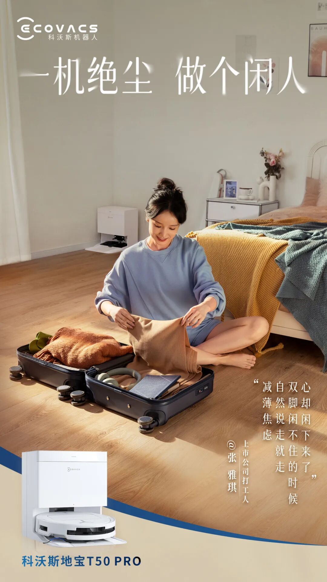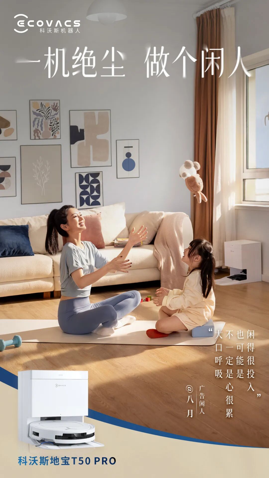 除了TVC以外,科沃斯还发布了T50 PRO《闲人生活哲学》场景海报,向受众传递闲人生活哲学,以及地宝 T50 PRO 的强大卖点。