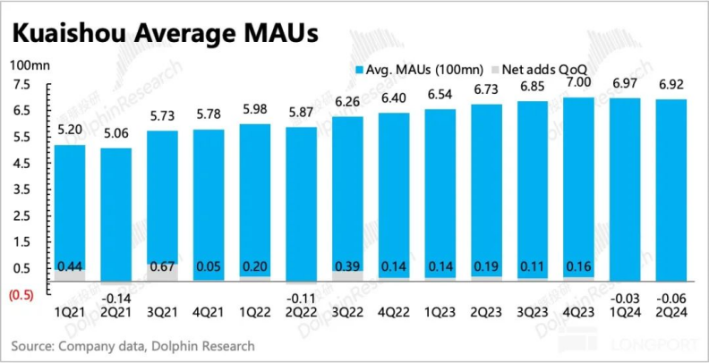 2024年第二季度,快手MAU为6.92亿人,低于市场预期的6.99亿人,环比下滑0.8%,已连续两个季度下滑。