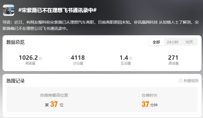 随后,话题#宋紫薇已不在理想飞书通讯录中#冲上了微博热搜。