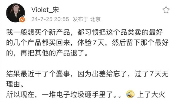 事情发生在今年7月,起因是宋紫薇在分享自己的消费习惯时吐露真言,“把这个品类卖的最好的几个产品都买回来,体验7天,然后留下那个最好的,再把其他的产品退了。”