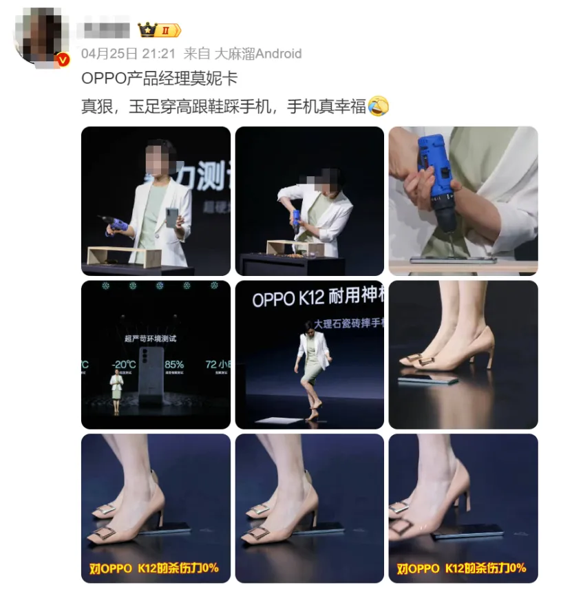 在今年4月OPPO K12发布会上,端庄大气的莫妮卡贡献了几个暴力测试手机的名场面,包括让手机从1.5米空中落地,用电钻钻屏幕,以及用高跟鞋猛踩。