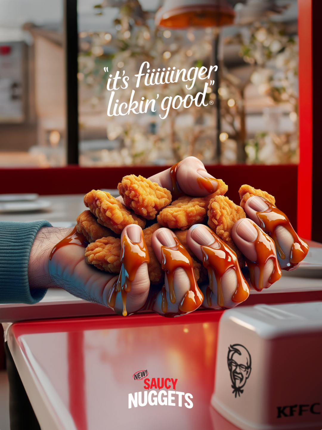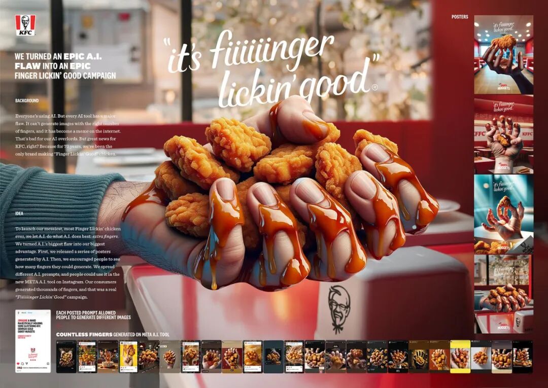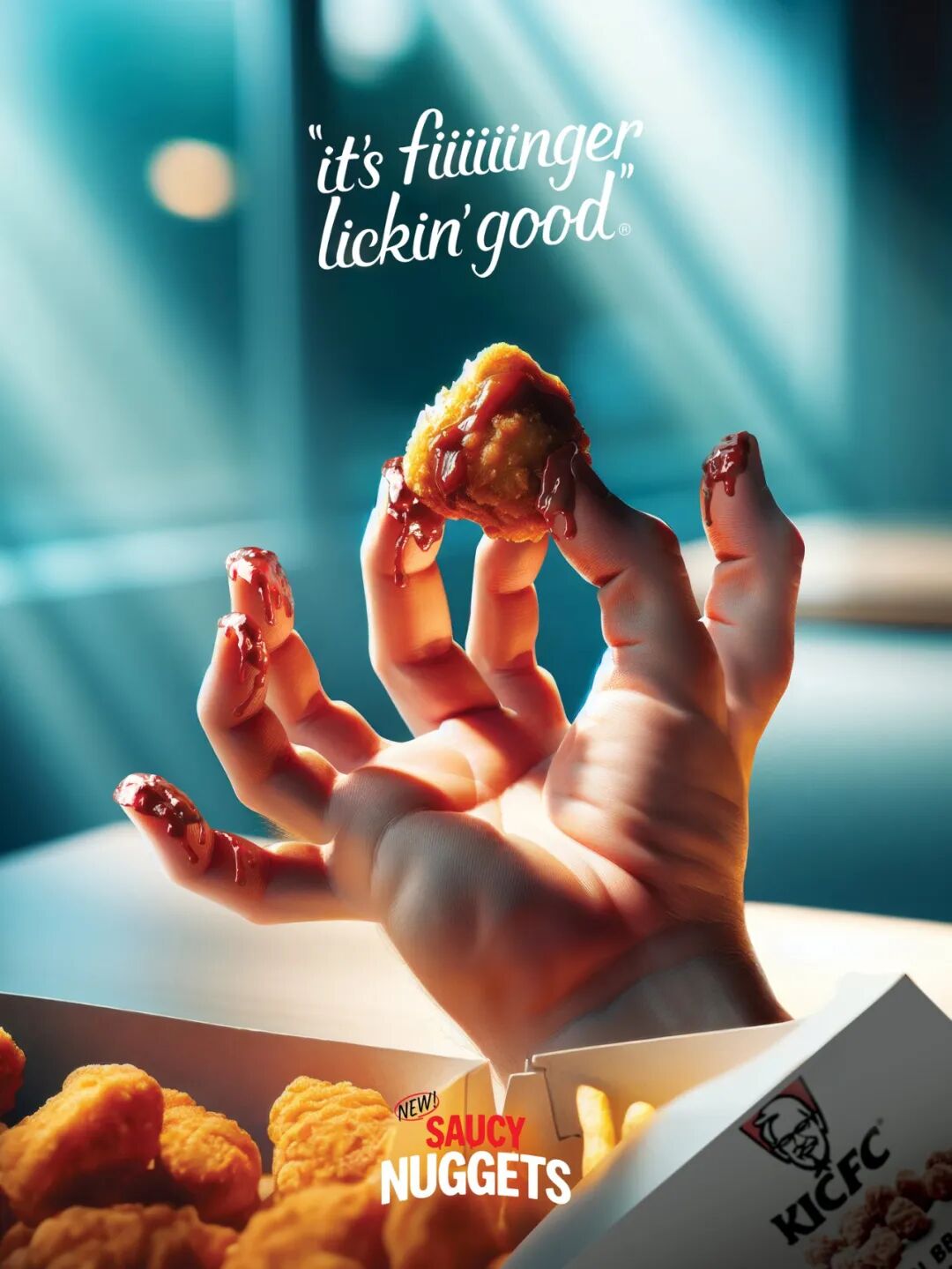 据了解,这个系列广告是肯德基用AI自动生成,创作的灵感源自于“好吃到吮指”。