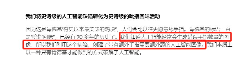 将人工智能备受诟病的“多指”缺点变成宣发优点,创意逻辑就这样完美闭环了,不得不说肯德基这招实在高明。