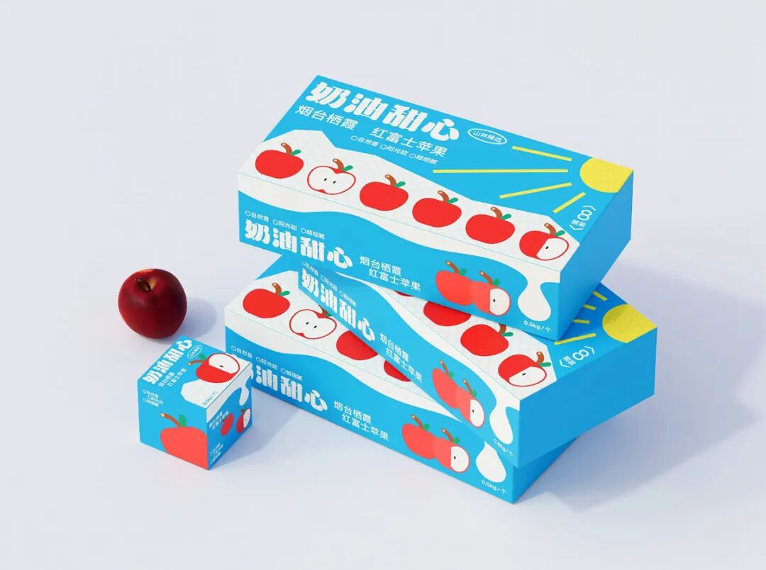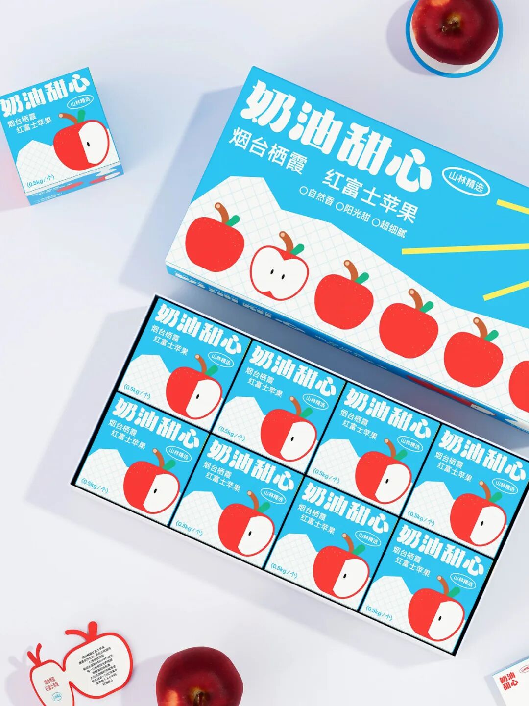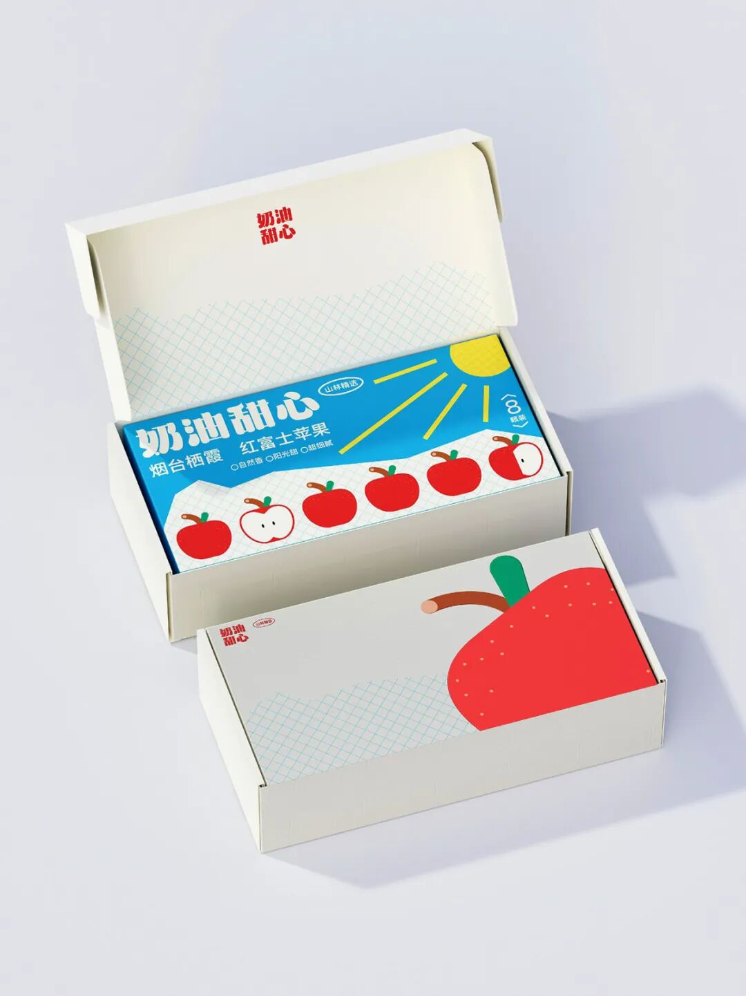 第二款来自烟台的红富士苹果创意包装,礼盒一改以往的沉稳、朴实风格,而是以更年轻、活泼的视觉形象展现给大众,也巧妙呼应该款产品品类--奶油甜心的概念。盒面底部的插画铺满了苹果元素,既有完整的果型,也有切面状的图案,画面右上方则是阳光照射的瞬间,侧面映衬出所培育的红富士苹果品质上乘,值得信赖。