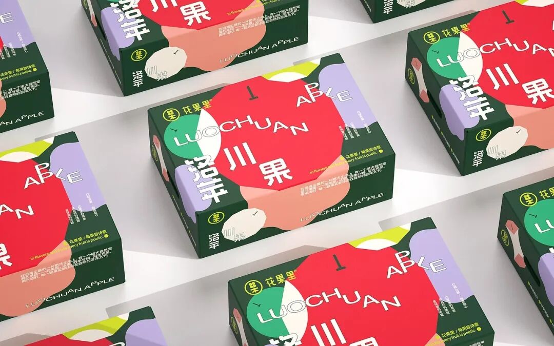 礼盒以扁平化的几何图形勾勒苹果外形,并通过不同的色彩进行层叠和拼接,形成丰富且斑斓的画面视觉,“洛川苹果”等产品名则以不规则的错落排版穿插在插画之中,整体视觉更加灵动、活力,在货架陈列上也能起到很好的辨识度。