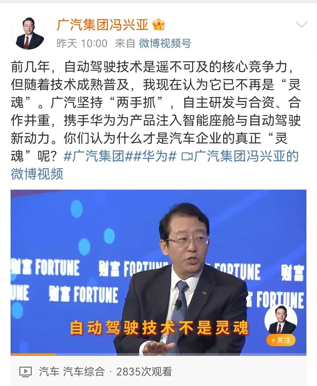 而就在昨天,广汽集团总经理在微博上发表了一段耐人寻味的视频,对上汽董事长陈虹的“灵魂论”做出了更具时代性的补充,他说到: