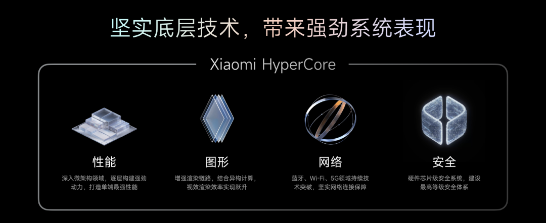 首先是Xiaomi HyperCore,这是小米的自研底层核心技术集,包括了性能、图形、网络和安全四个方面的底层技术。