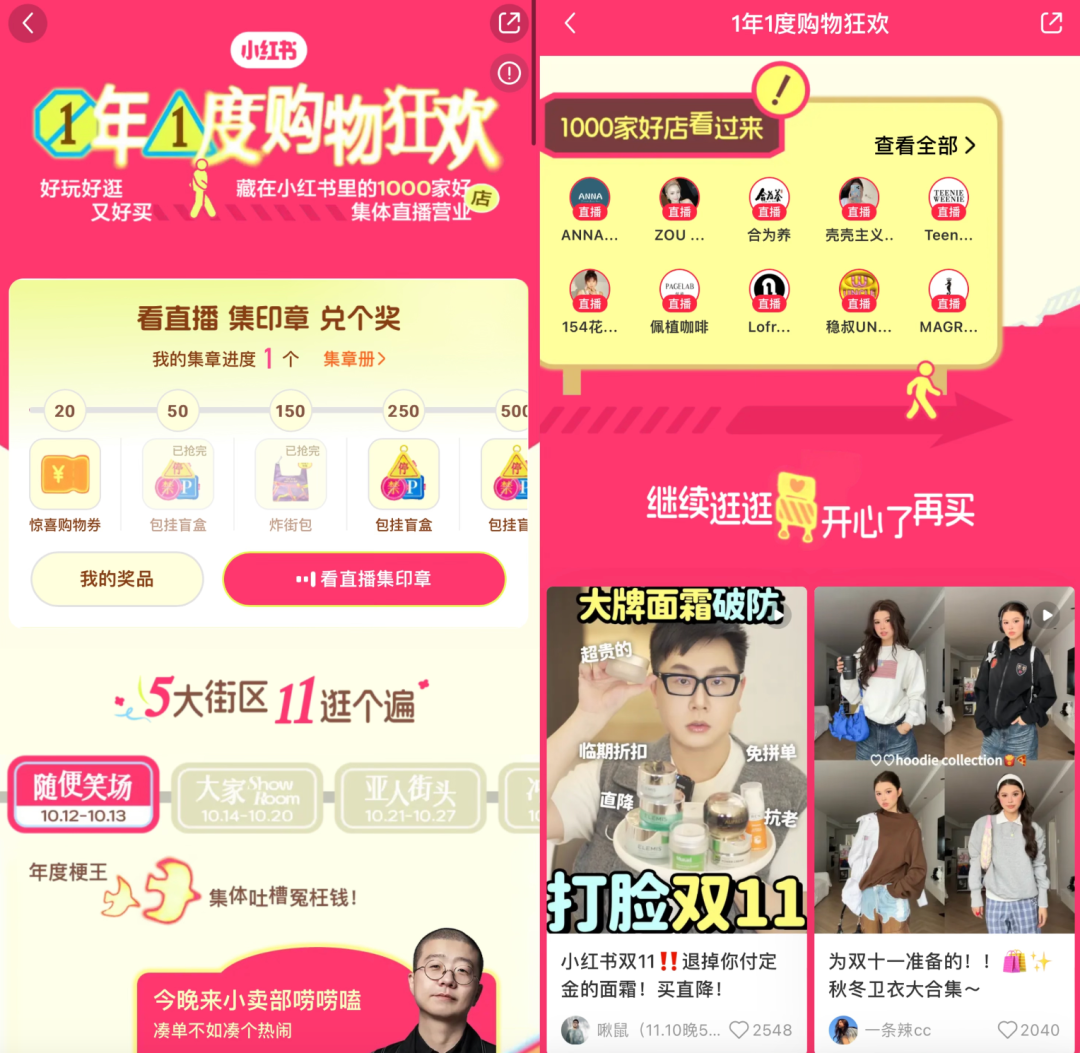 相比之下,小红书在用户体验上给出了不同的答案——不做传统大促,而是打造了一场“1年1度购物狂欢”,把线下逛街的用户体验搬到线上,选出了1000+多元细分生活方式的店铺,并分成随便笑场、亚人街头、冲动酒吧、大家showroom和乐透狂欢5个主题街区,同时设置了集章换好物的玩法,让大家在线上也可以好逛好玩好买。
