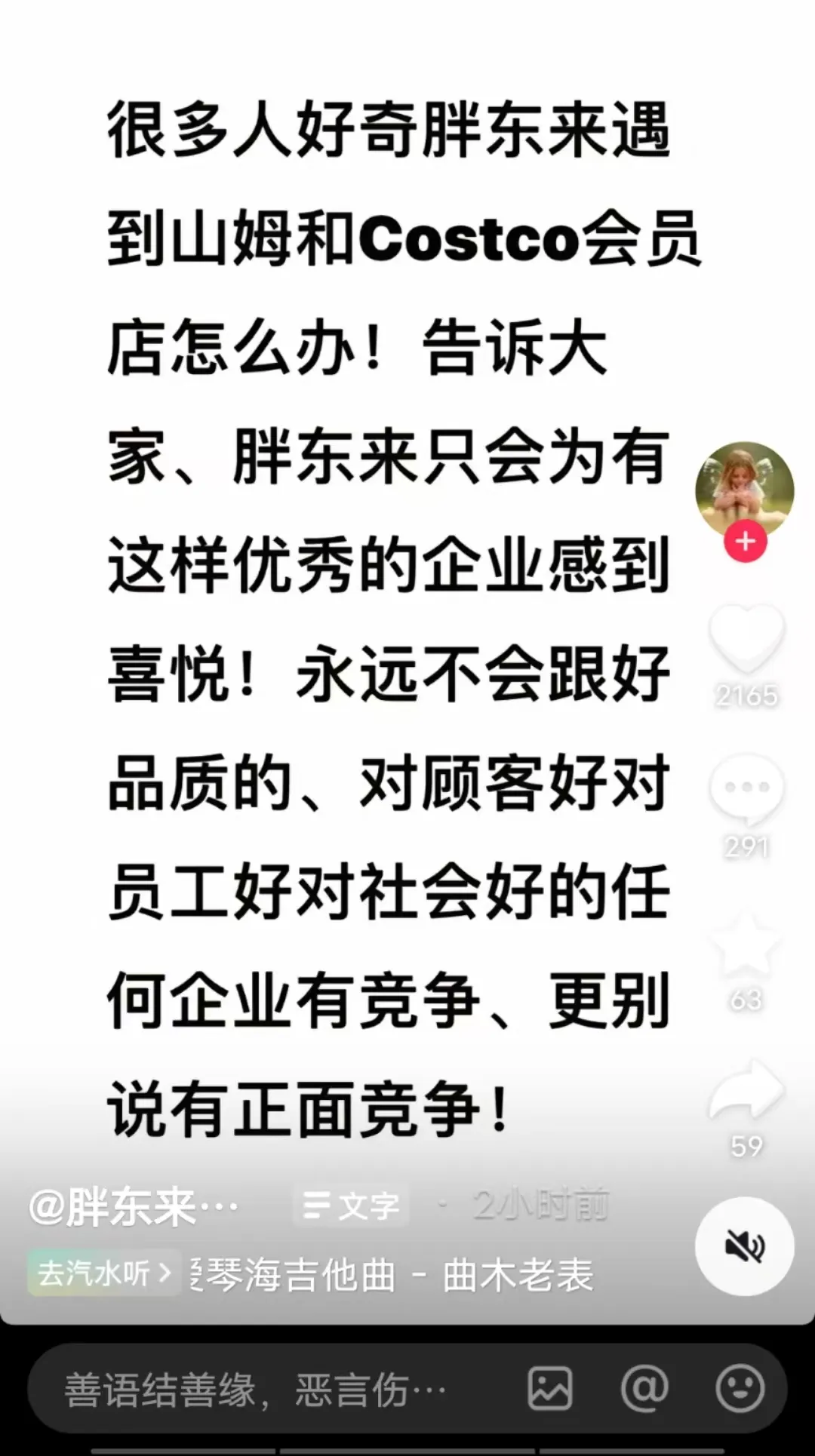 昨日(10月30日),于东来就山姆进驻河南一事,发表了自己的看法,他称:“胖东来只会为有这样优秀的企业(山姆和Costco)感到喜悦,永远不会跟好品质的、对顾客好、对员工好、对社会好的任何企业有竞争、更别说有正面竞争!”