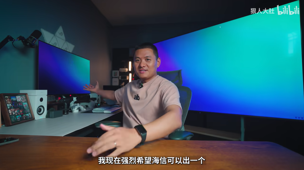 另外一位B站UP主“狠人大肚”,也是见证电视机热度的博主。他有7万多粉丝,日常视频的C位,多集中在笔记本、键盘、投影仪等更有热度的产品上。今年,他做了两期跟电视机有关的测评,点击量立刻攀升视频的前列。