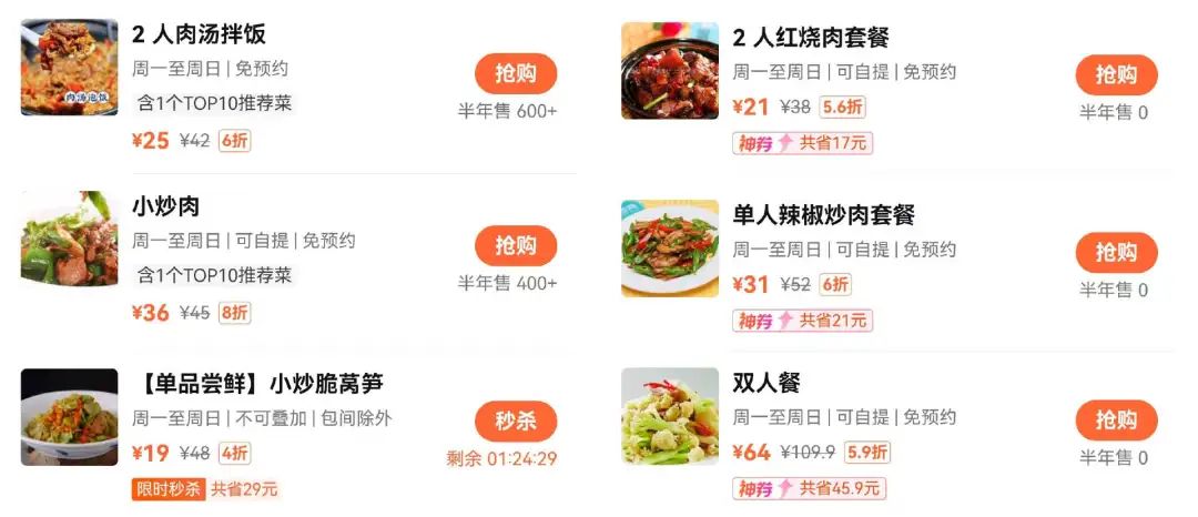 以内参君所在的北京朝阳望京区域来看,3KM内,共有67家湘菜馆(其中包含3家暂停营业、2家尚未开业),既有费大厨、辣可可、潇湘阁等品牌,也有一些土菜馆、盖码饭等餐厅。一些餐厅推出了“2人肉汤拌饭”的餐品,价格25元,半年销售量全店第一;“小炒肉”单品打了8折后,价格36元,也算比较实惠的存在;“4折菜品”用来引流的现象不少;还有不少20-30元的“单人小炒套餐”。