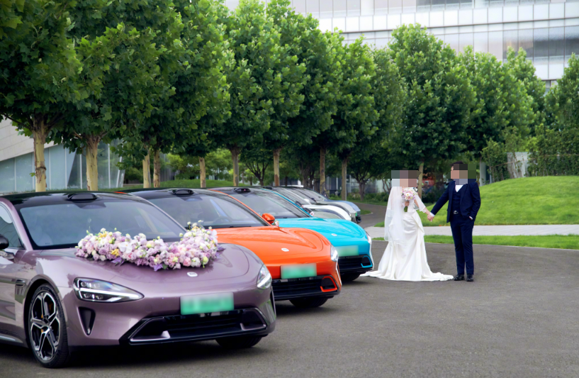 今年6月,小米人在婚礼上用9种不同颜色的小米SU7组成婚车车队。