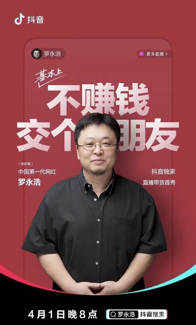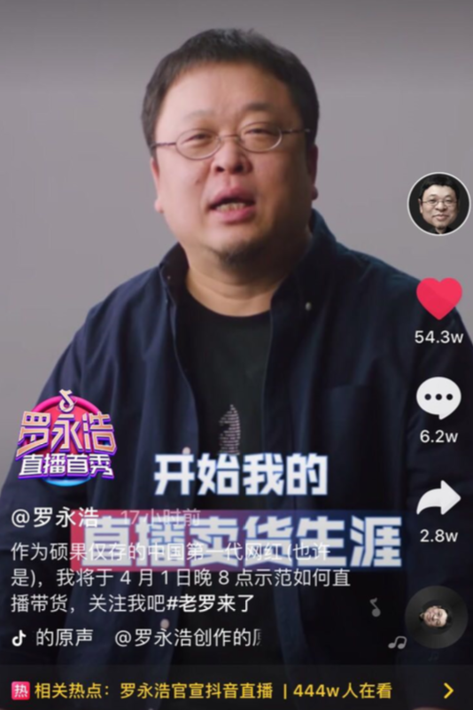 3月26日,罗永浩宣布将于4月1日晚8点在抖音示范直播带货。