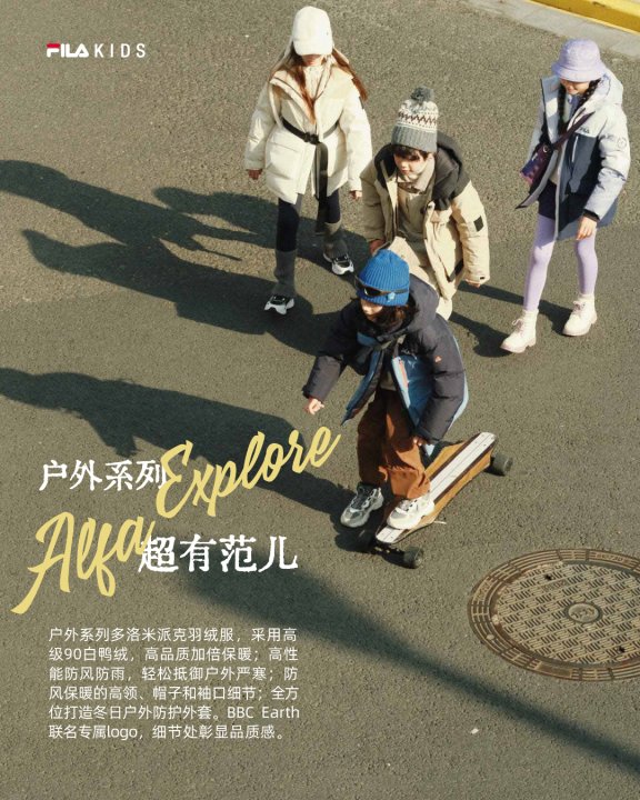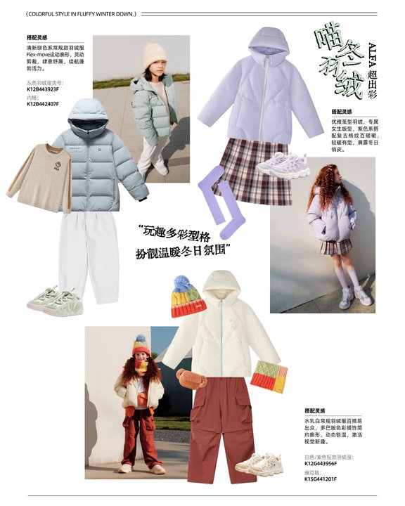 FILA KIDS 正式推出的《喵冬录客 LOOKER》杂志,以「ALFA 超会穿」为主题,为孩子们带来一份满载惊喜与温暖的冬季羽绒时尚指南。穿搭风格巧妙融合了今冬时尚密码:叠穿,机能,复古等风格,塑造既潮流又舒适的穿搭新风尚,旨在为孩子们打造一个时尚温暖的冬季衣橱。