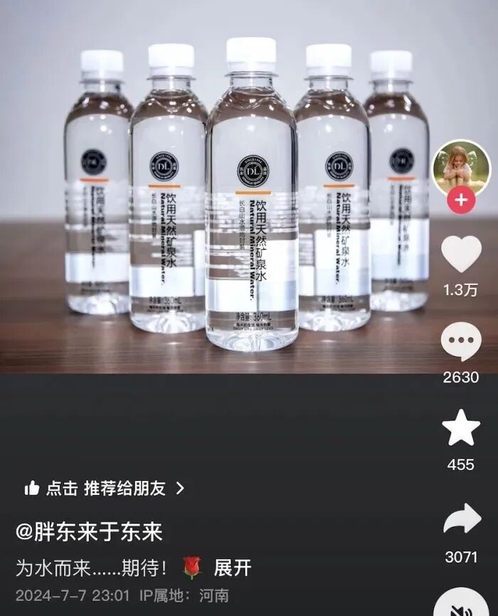 比如,首次进入瓶装水赛道的东方甄选,选择了位于长白山地区,富含偏硅酸和适量矿物质与微量元素的水源,看上去满满的矿物质。