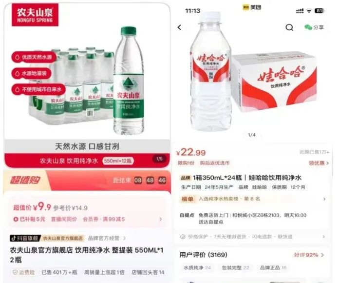 在农夫山泉抖音旗舰店内,参考价14.9元/件的绿瓶纯净水,目前优惠价9.9元/件,每件规格为12瓶,一瓶550ml,折算下来单瓶价格约0.82元。据客服介绍,9.9元/件的优惠价格每人限购5件。在美团优选中,24瓶350ml的哇哈哈纯净水只需22.99元;596ml规格的一箱24瓶,也只需25.99元,单瓶价格仅1.08元。